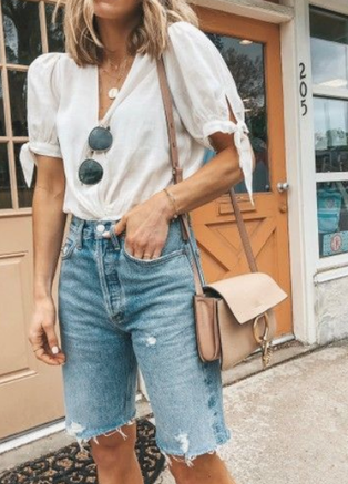 Take a classic pair of jeans or pants (or thrift a pair) and cut them into Bermuda shorts – they are back! If you have a dress pant you no longer love, think about taking them to your tailor and getting them cut into Bermuda shorts.